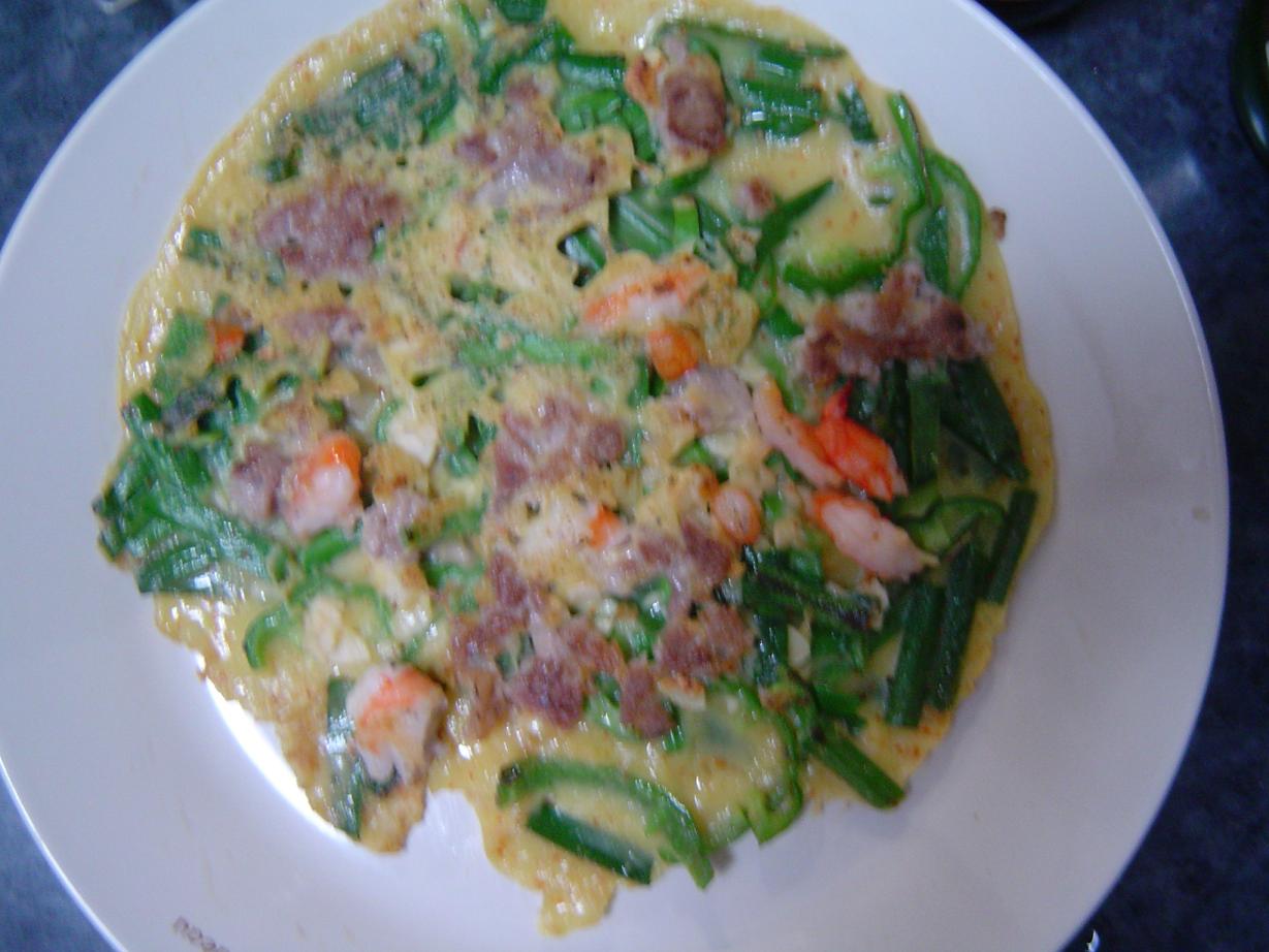 今晩のおかずはかつおのたたきと、えびとぶたにくのちぢみ。ちょっと安い卵を買ったら、やたら黄色味が